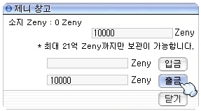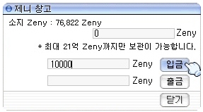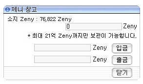 メインウィンドウにあるBankボタン(またはCtrl+B)を押すと専用ウィンドウが開く。リヒタルゼンの銀行は無関係? 1アカウントで取り扱える最大額は21億(2.1G)zeny。それ以上預金した場合どうなるかは不明。